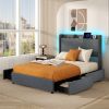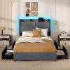 KOMFOTT Upholstered Bed Frame with 4 Storage Drawers & LED Lights, Wingback Headboard & Charging Station