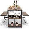 KOMFOTT Dining Table Set for 4, 3-Piece 55" L Kitchen Table Set w/ 2 Benches, Breakfast Table w/ 5-Bottle Wine Rack & Glass Holder