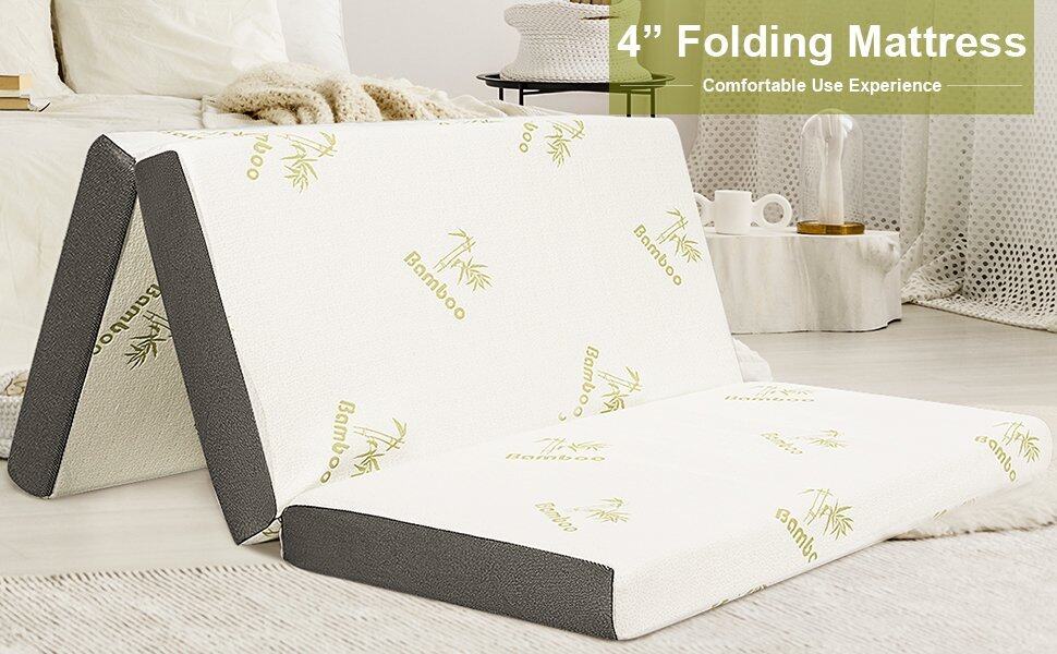 KOMFOTT 4" Tri-Folding Mattress with Storage Bag, Memory Foam Mattress with Removable Bamboo Cover