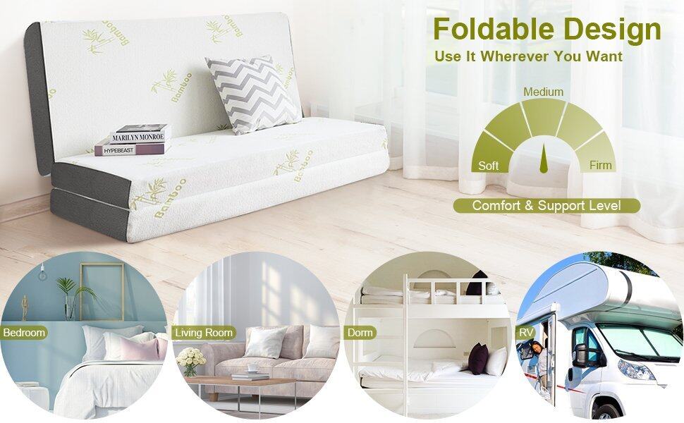 - Ergonomic Support for Pressure Relief: Thanks to the bamboo charcoal support foam layer, the tri-fold mattress can effectively keep the air fresh and provide high-intensity support for your body. In addition, to ensure spine protection, this memory foam mattress with medium firmness is an ideal choice for all sleepers.