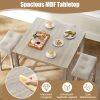 Upgrade your dining space with this stylish 5-piece dining set, ideal for small apartments, kitchens, or breakfast nooks. Featuring a compact square table and 4 padded stools, this dining set comfortably seats 4 while maximizing your living area. With its solid rubber wood legs, the kitchen table set is built to last, offering reliable support for everyday use. The table features a spacious MDF tabletop, adding a sleek look that resists scratches and spills for easy maintenance. The comfortable stools are designed with high-density sponge cushioning, breathable fabric, and stylish tufted button detail, ensuring maximum comfort. Built-in footrest provides added support, enhancing relaxation during meals or gatherings. Plus, when not in use, the stools can be stored neatly under the table to save space. Elevate your home decor with this square dining table set that combines functionality, style, and comfort.