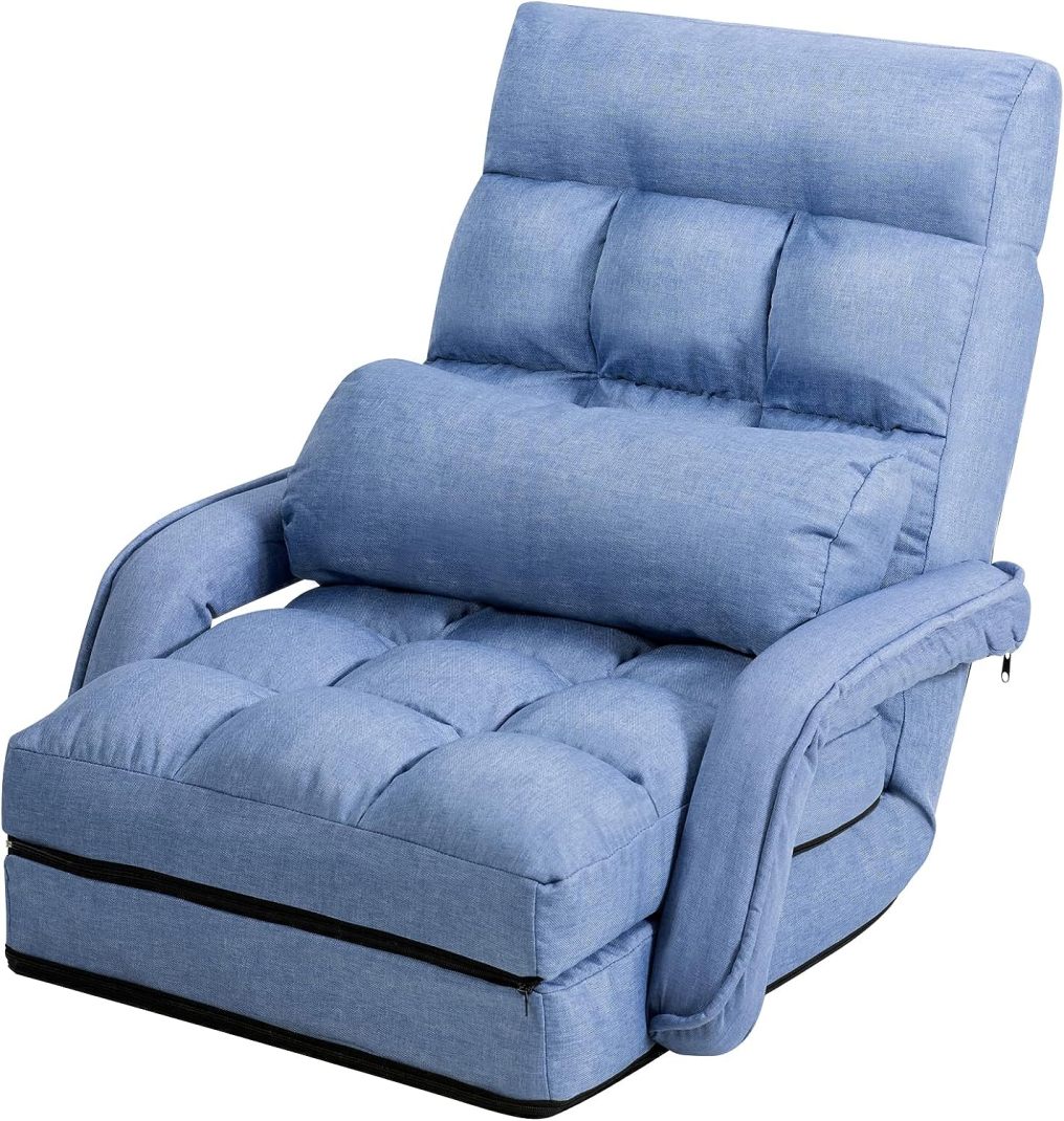 - 【Adjustable Back with Linkage Armrests】: This floor chair features an adjustable back that can be fixed in 5 different reclining angles to meet your diverse needs of sitting, lying or more. The armrest will adjust automatically along with the back, making the lounge chair more comfortable and convenient to use. And the pillow also can greatly relax your lumbar and relieve your fatigue.