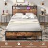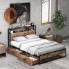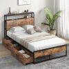 KOMFOTT Bed Frame with 2 Storage Drawers and Charging Station, Rustic Metal Slats Support Mattress Foundation