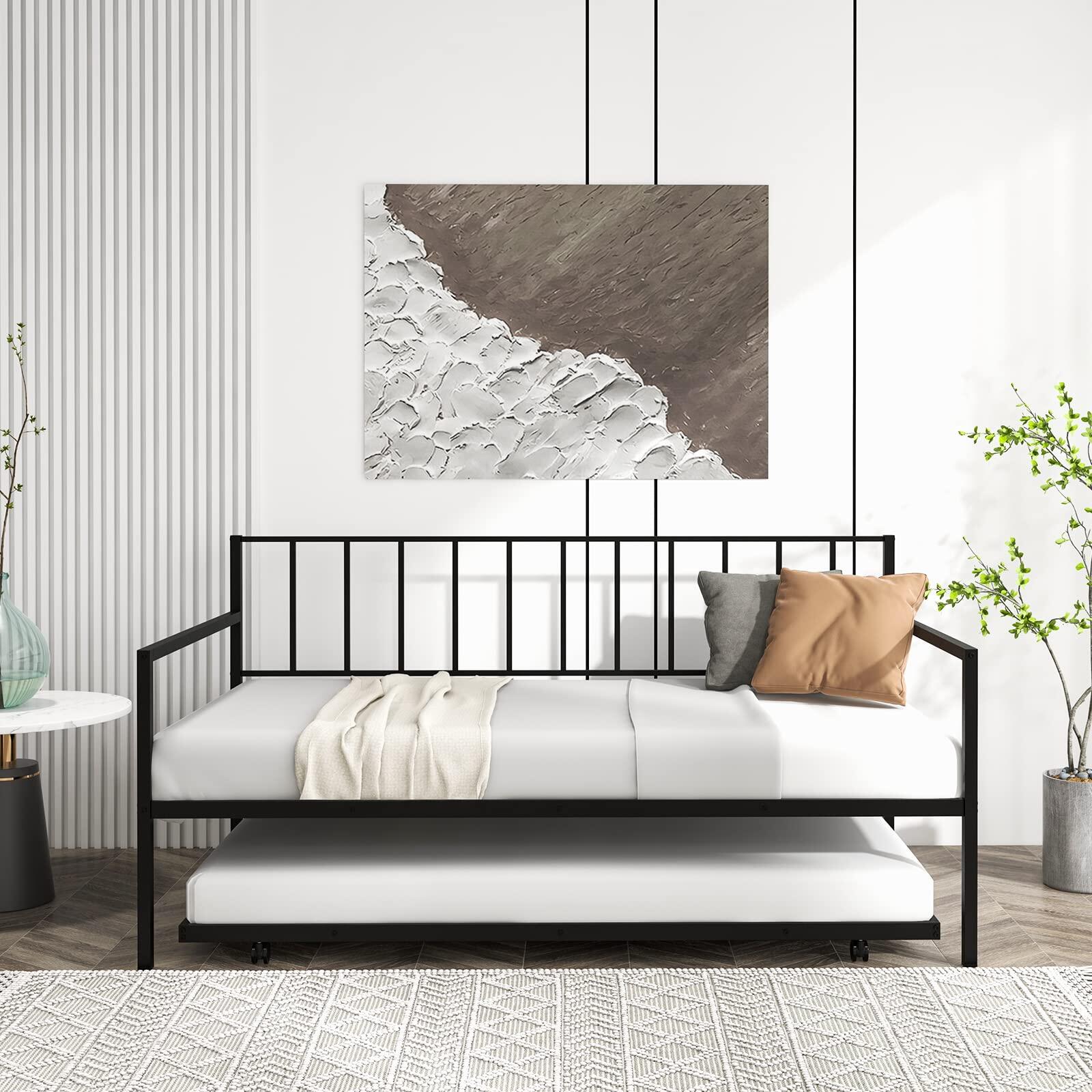 - 2-in-1 Design for Saving Space: The daybed consists of 2 twin bed frames to maximize your limited space, serving great as a bed or a sofa. Meanwhile, the metal twin bed can be used as 2 single beds, which provides a comfortable sleeping area for guests or sleepovers.
