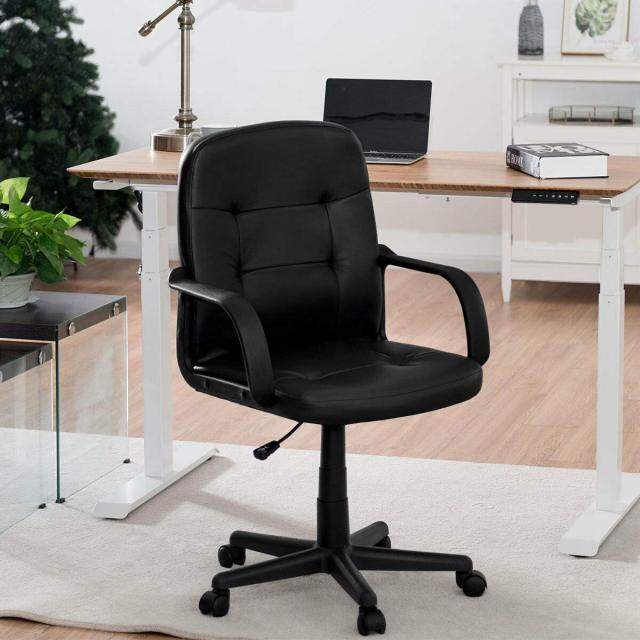 The leather desk chair combines stylish design with comfortable sitting feeling. Supported by a sturdy 5-claw base and a high quality gas rod, this office chair is strong enough to hold up to 300 lbs. With ergonomic design, the mid back chair provides optimal back and lumbar support, extremely alleviating the fatigue after a long day’s work. The smooth PU leather upholstery offers you a soft touch. And the seat height and backrest can be easily adjusted to meet your ideal position. What's more, 5 flexible wheels make the chair easy to move around. This swivel executive chair is definitely a perfect addition to your house and office!